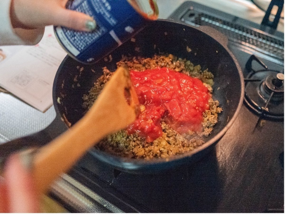 トマト缶で肉のだしごと煮て、とがってる酸味を無くなるまでグツグツさせればいいということだけを念頭に置いて、