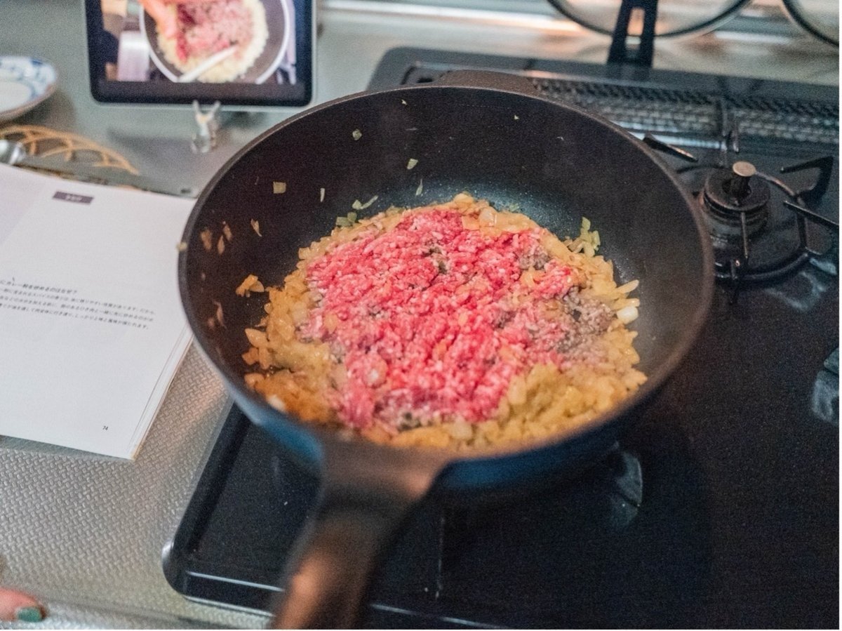 「ということで、ひき肉にもメイラード反応を起こしたいのです。ひき肉は炒めるとだしが出るのと、焦げの直前に旨みがつまってるので、フライパンの中央に薄く広げましょう」