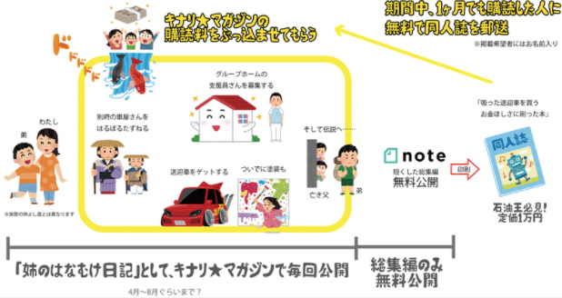 ・連載期間中、一度でも購読すると、数ヶ月後に同人誌が無料で届きます。記事最下部のフォームからお申し込みください。